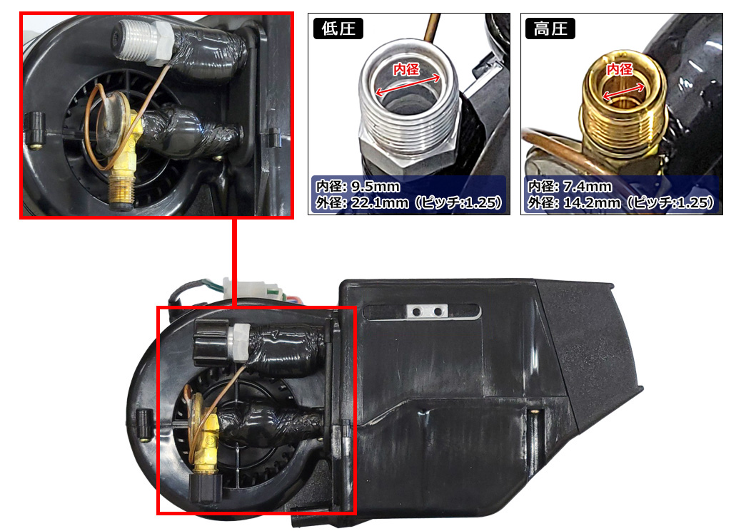 【高圧】内径: 7.4mm 外径: 14.2mm , ピッチ: 1.25【低圧】内径: 9.5mm 外径: 22.1mm , ピッチ: 1.25